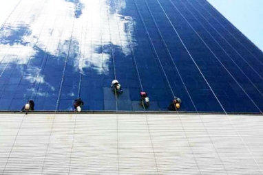 4.作业人员穿上雨裤,携带工具、清洁剂上吊篮或吊板。有些工具应用松紧绳栓在吊篮或吊板上,以防不小心失手落下,伤了行人。在地面上设拦护绳和安全告示牌。